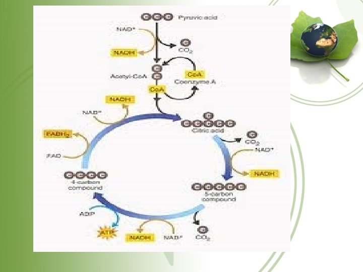 • The purpose of the Krebs's cycle is to store energy in two molecules • FAD + H 2 → FADH 2 • NAD +H → NADH • All the energy that was in the glucose is now in these two molecules.