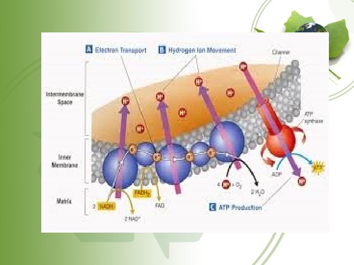 Electron Transport Chain • This next step occurs only when oxygen is present. • The energy in NADH and FADH pass e- down the ETC. Very similar to the ETC in Photosynthesis. • The H+ ions are pumped in and out of the inner mitochondrion membrane.