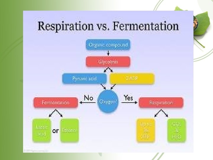 Fermentation • When oxygen is not available to accept the electrons from NADH. The Pyruvate accepts the electron instead. • When NAD gets rid of electrons it becomes NAD+ and is recycle to begin glycolysis again. • This process allows 2 ATP molecules to be made instead of 34 in aerobic respiration.
