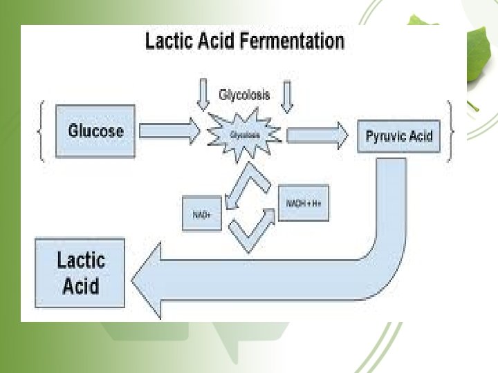 1. Lactic Acid Fermentation • By using pyruvate to accept the electrons instead of oxygen. The byproduct lactic acid is produced. • Lactic acid is what causes burning in a runners muscles.