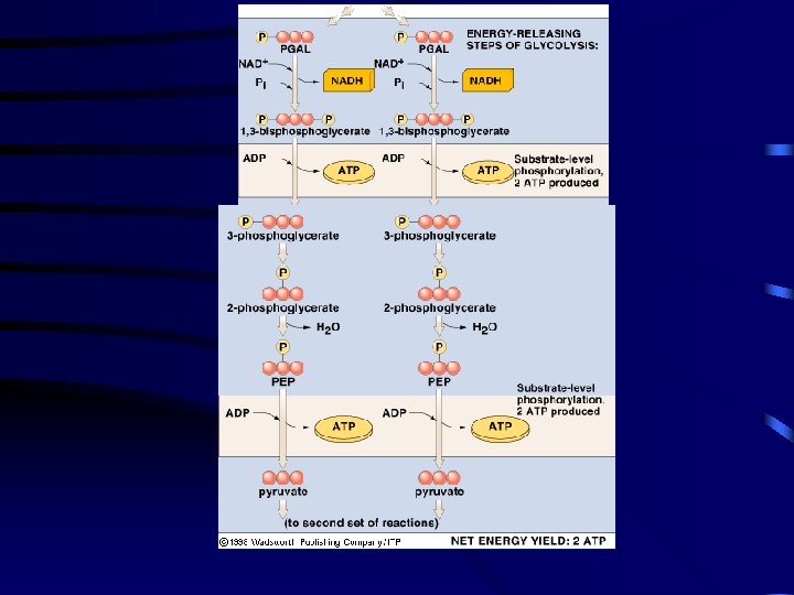 B. Stages 1. energy investment phase a. glucose is phosphorylated by 2 ATP molecules 2. energy releasing phase a. glucose is split to form 4 ATP and 2 pyruvate molecules. b. electrons captured by NAD+ to form NADH (to ETS) c. ATP is produced by substratelevel phosphorylation.
