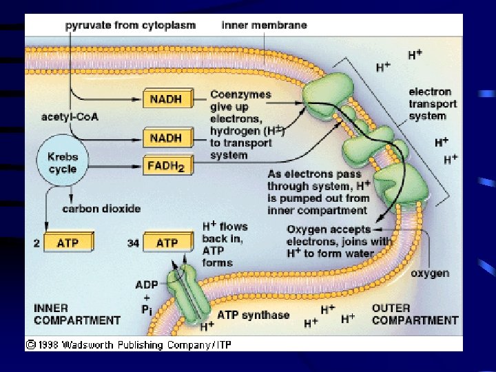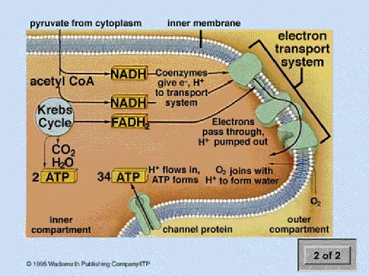 Electron Transport System (ETS) A. General 1. inputs are the NADH and FADH 2 from glycolysis and the Krebs cycle a. processes electrons, not carbon 2. located on the inner membrane of the mitochondria (integral proteins) 3. uses oxygen as a terminal electron receptor