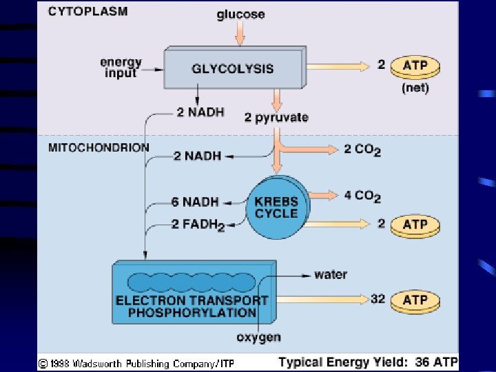 Summary of Energy Harvest A. ATP per glucose 1. glycolysis 2 ATP 2. Krebs 2 ATP 3. ETS 32 ATP B. Variations 1. yield per glucose may be 32 -38 ATP depending on cell type