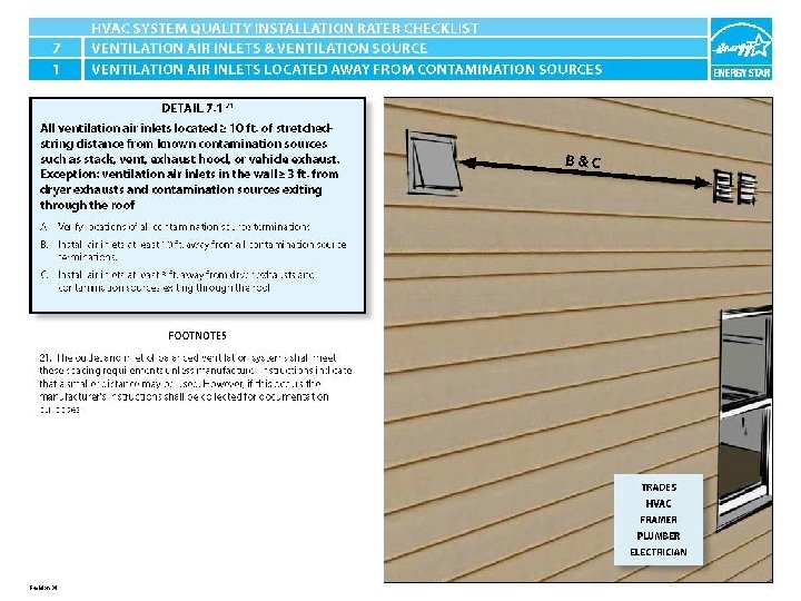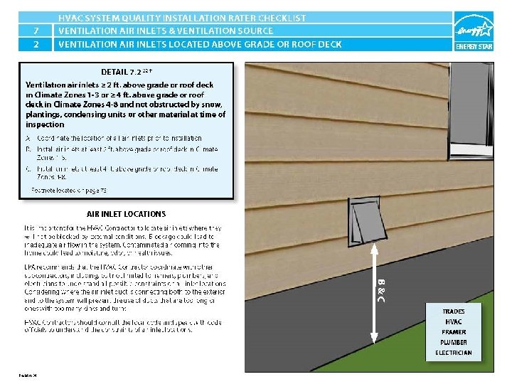 ENERGY STAR® QUALIFIED HOMES HVAC SYSTEM QUALITY INSTALLATION RATER CHECKLIST SECTION 7. AIR INLETS & VENTILATION SOURCE 7. 1 All ventilation air inlets located ≥ 10 ft. of stretchedstring distance from known contamination sources such as stack, vent, exhaust hood, or vehicle exhaust. Exception: ventilation air inlets in the wall ≥ 3 ft. from dryer exhausts and contamination sources exiting through the roof. 21 7. 2 Ventilation air inlets ≥ 2 ft. above grade or roof deck in Climate Zones 1 -3 or ≥ 4 ft. above grade or roof deck in Climate Zones 4 -8 and not obstructed by snow, plantings, condensing units or other material at time of inspection. 22