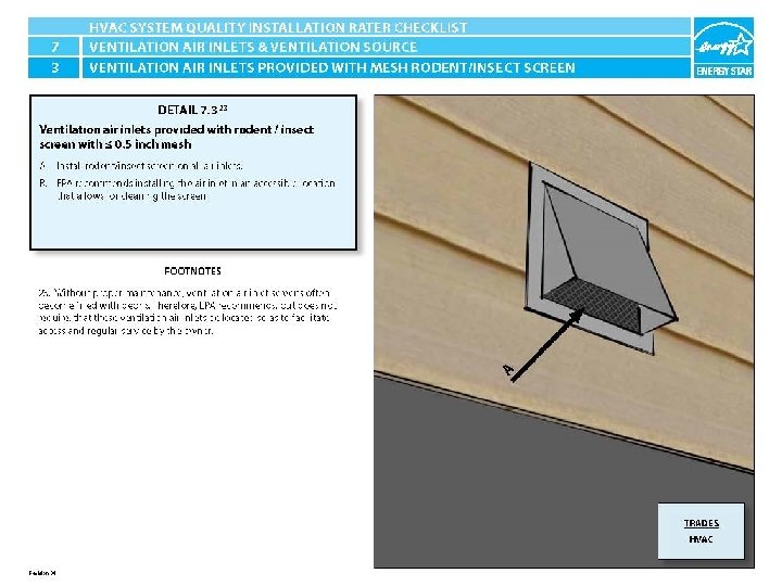 ENERGY STAR® QUALIFIED HOMES HVAC SYSTEM QUALITY INSTALLATION RATER CHECKLIST SECTION 7. AIR INLETS & VENTILATION SOURCE 7. 3 Ventilation air inlets provided with rodent / insect screen with ≤ 0. 5 inch mesh. 23