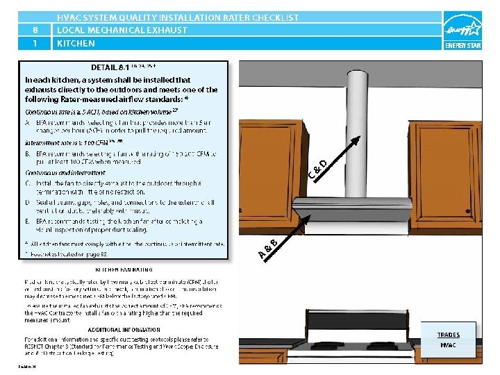 ENERGY STAR® QUALIFIED HOMES HVAC SYSTEM QUALITY INSTALLATION RATER CHECKLIST SECTION 8. LOCAL MECHANICAL EXHAUST In each kitchen and bathroom, a system shall be installed that exhausts directly to the outdoors and meets one of the following Rater measured airflow standards: 18, 24, 25 8. 1 Kitchen Continuous: ≥ 5 ACH, based on kitchen volume 27 Intermittent Rate 26 : ≥ 100 CFM 28