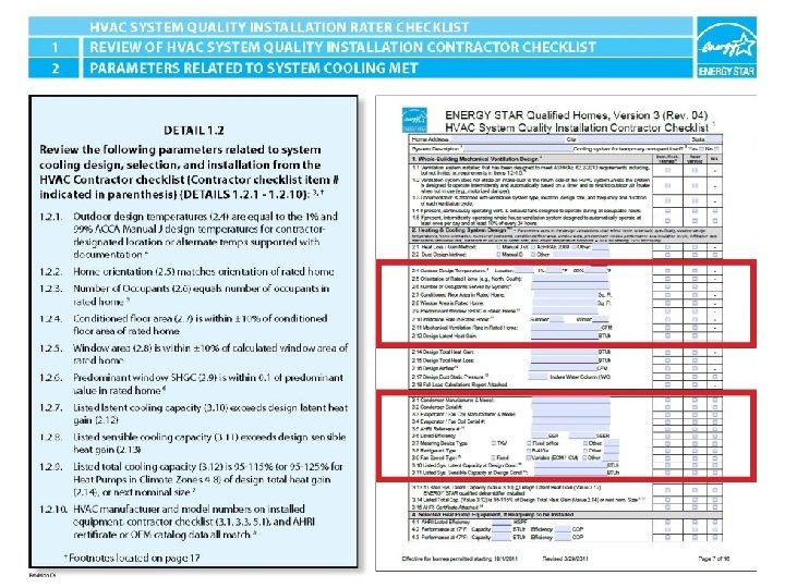 ENERGY STAR® QUALIFIED HOMES HVAC SYSTEM QUALITY INSTALLATION RATER CHECKLIST SECTION 1. REVIEW OF HVAC SYSTEM QUALITY INSTALLATION CONTRACTOR CHECKLIST 2 1. 2. 7 1. 2. 8 1. 2. 9 1. 2. 10 Listed latent cooling capacity (3. 10) exceeds design latent heat gain (2. 12) Listed sensible cooling capacity (3. 11) exceeds design sensible heat gain (2. 13) Listed total cooling capacity (3. 12) is 95 -115% (or 95125% for Heat Pumps in Climate Zones 4 -8) of design total heat gain (2. 14), or next nominal size 7 HVAC manufacturer and model numbers on installed equipment, contractor checklist (3. 1, 3. 3, 5. 1), and AHRI certificate or OEM catalog data all match 8 HVAC System Quality Installation Rater Checklist