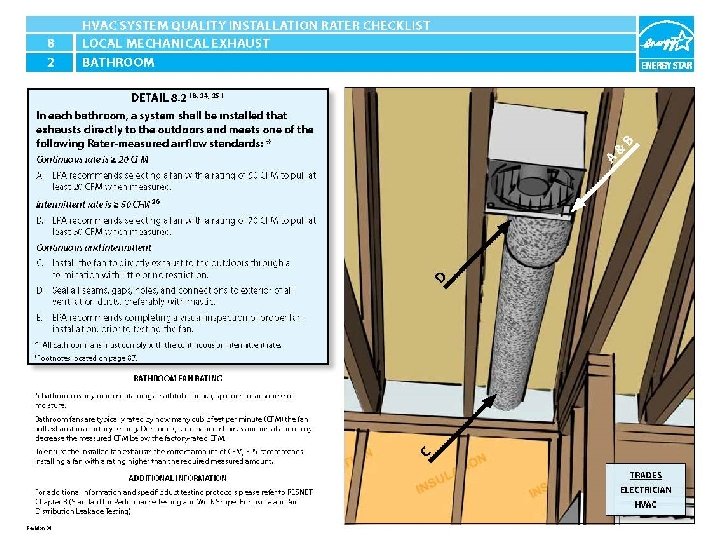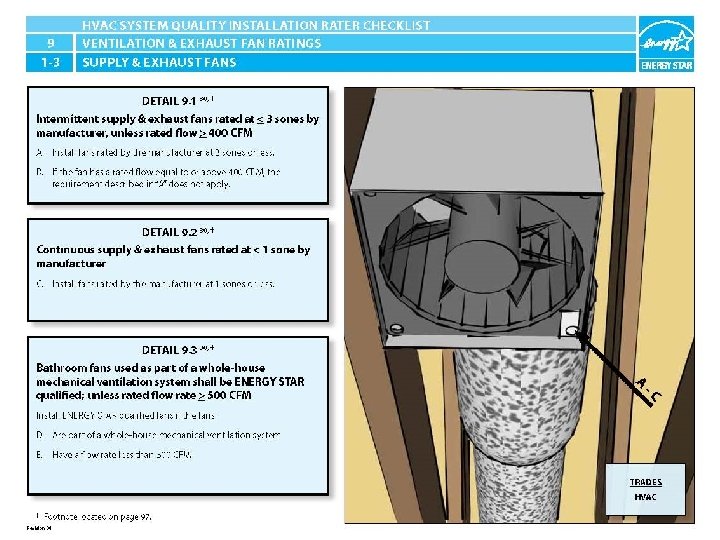9. 1 -3 Bathroom fans used as part of a whole-house mechanical ventilation system shall be ENERGY STAR qualified; unless rated flow rate ≥ 500 CFM. LD CJ D/E The fan does not have an ENERGY STAR label. The fan has an ENERGY STAR label. HVAC System Quality Installation Rater Checklist