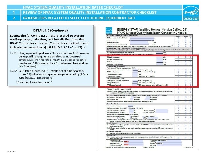 ENERGY STAR® QUALIFIED HOMES HVAC SYSTEM QUALITY INSTALLATION RATER CHECKLIST SECTION 1. REVIEW OF HVAC SYSTEM QUALITY INSTALLATION CONTRACTOR CHECKLIST 2 1. 2. 11 1. 2. 12 Using reported liquid line (6. 3) or suction line (6. 5) pressure, corresponding temp. (as determined using pressure/temperature chart for refrigerant type) matches reported condenser (7. 1) or evaporator (7. 5) saturation temperature (+/- 3 degrees) 9 Calculated subcooling (7. 1 minus 6. 4) or superheat (6. 6 minus 7. 5) value equals reported target subcooling (7. 3) or superheat (7. 7) temperature 9 HVAC System Quality Installation Rater Checklist