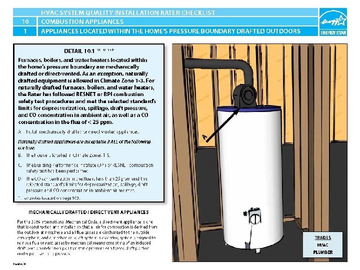 ENERGY STAR® QUALIFIED HOMES HVAC SYSTEM QUALITY INSTALLATION RATER CHECKLIST SECTION 10. COMBUSTION APPLIANCES 10. 1 Furnaces, boilers, and water heaters located within the home’s pressure boundary are mechanically drafted or direct-vented. As an exception, naturally drafted equipment is allowed in Climate Zone 1 -3. For naturally drafted furnaces, boilers, and water heaters, the Rater has followed RESNET or BPI combustion safety test procedures and met the selected standard’s limits for depressurization, spillage, draft pressure, and CO concentration in ambient air, as well as a CO concentration in the flue of ≤ 25 ppm. 31, 32, 33