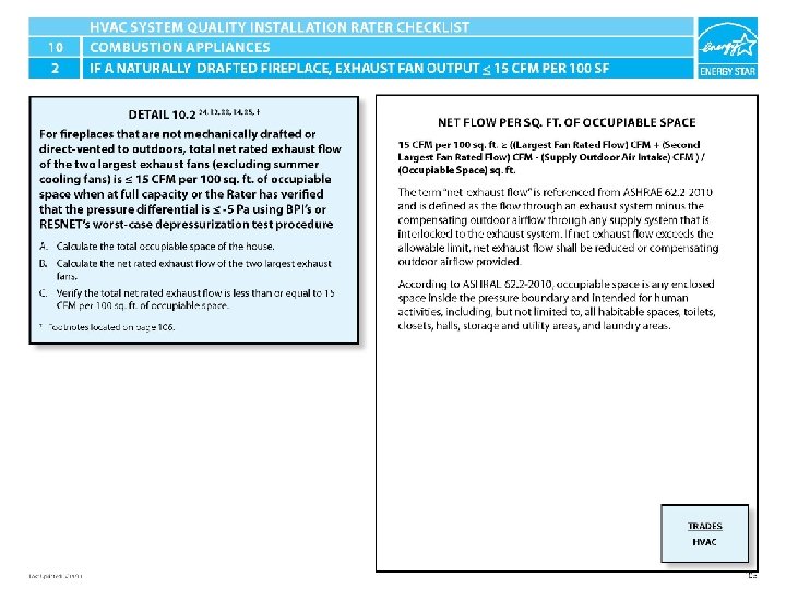 ENERGY STAR® QUALIFIED HOMES HVAC SYSTEM QUALITY INSTALLATION RATER CHECKLIST SECTION 10. COMBUSTION APPLIANCES 10. 2 For fireplaces that are not mechanically drafted or direct-vented to outdoors, total net rated exhaust flow of the two largest exhaust fans (excluding summer cooling fans) is < 15 CFM per 100 sq. ft. of occupiable space when at full capacity or the Rater has verified that the pressure differential is ≤ -5 Pa using BPI’s or RESNET’s worst-case depressurization test procedure. 24, 32, 33, 34, 35