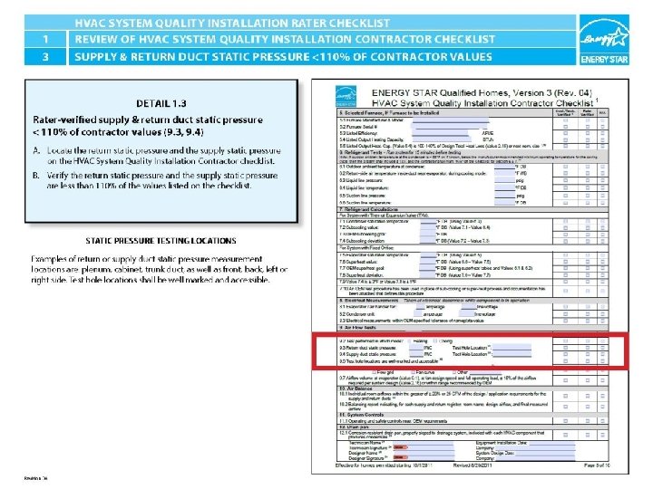 ENERGY STAR® QUALIFIED HOMES HVAC SYSTEM QUALITY INSTALLATION RATER CHECKLIST SECTION 1. REVIEW OF HVAC SYSTEM QUALITY INSTALLATION CONTRACTOR CHECKLIST 2 1. 3 Rater-verified supply & return duct static pressure<110% of contractor values (9. 3, 9. 4) HVAC System Quality Installation Rater Checklist
