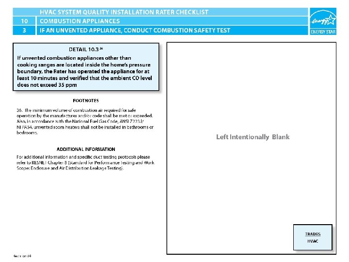 ENERGY STAR® QUALIFIED HOMES HVAC SYSTEM QUALITY INSTALLATION RATER CHECKLIST SECTION 10. COMBUSTION APPLIANCES 10. 3 If unvented combustion appliances other than cooking ranges are located inside the home’s pressure boundary, the Rater has operated the appliance for at least 10 minutes and verified that the ambient CO level does not exceed 35 ppm. 36