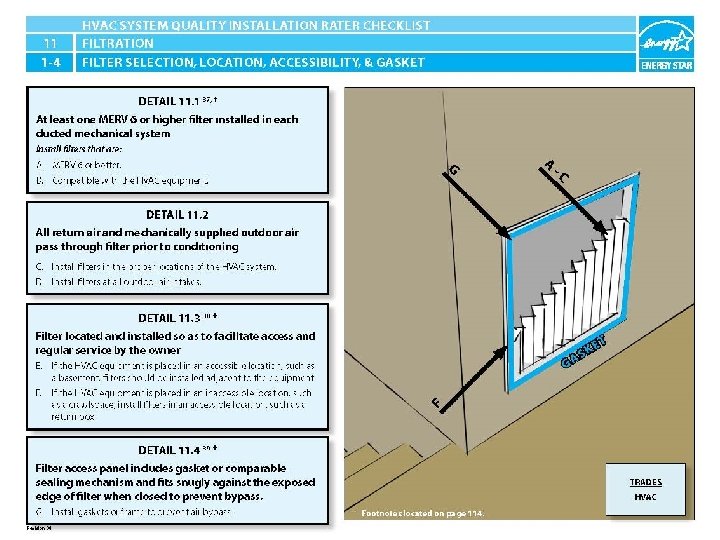 ENERGY STAR® QUALIFIED HOMES HVAC SYSTEM QUALITY INSTALLATION RATER CHECKLIST SECTION 11. FILTRATION 11. 1 At least one MERV 6 or higher filter installed in each ducted mechanical system. 37 11. 2 All return air and mechanically supplied outdoor air pass through filter prior to conditioning. 11. 3 Filter located and installed so as to facilitate access and regular service by the owner. 38 11. 4 Filter access panel includes gasket or comparable sealing mechanism and fits snugly against the exposed edge of filter when closed to prevent bypass. 39