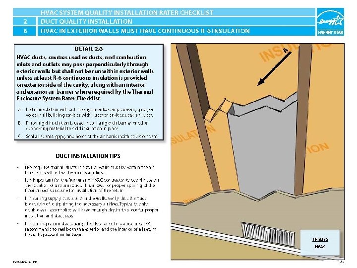 ENERGY STAR® QUALIFIED HOMES HVAC SYSTEM QUALITY INSTALLATION RATER CHECKLIST SECTION 2. DUCT QUALITY INSTALLATION 2. 6 HVAC ducts, cavities used as ducts, and combustion inlets and outlets may pass perpendicularly through exterior walls but shall not be run within exterior walls unless at least R-6 continuous insulation is provided on exterior side of the cavity, along with an interior and exterior air barrier where required by the Thermal Enclosure System Rater Checklist.