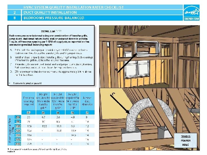 ENERGY STAR® QUALIFIED HOMES HVAC SYSTEM QUALITY INSTALLATION RATER CHECKLIST SECTION 2. DUCT QUALITY INSTALLATION 2. 7 Quantity & location of supply and return duct terminals match contractor balancing report. 2. 8 Bedrooms pressure-balanced using any combination of transfer grills, jump ducts, dedicated return ducts, and/or undercut doors to either: a) provide 1 sq. in. of free area opening per 1 CFM of supply air, as reported on the contractor-provided balancing report; or HVAC System Quality Installation Rater Checklist