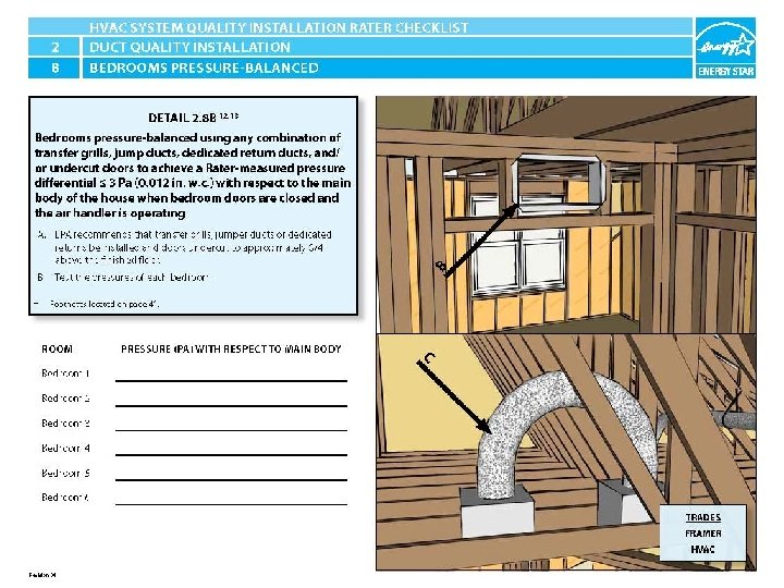 ENERGY STAR® QUALIFIED HOMES HVAC SYSTEM QUALITY INSTALLATION RATER CHECKLIST SECTION 2. DUCT QUALITY INSTALLATION 2. 8 Bedrooms pressure-balanced using any combination of transfer grills, jump ducts, dedicated return ducts, and/or undercut doors to either: b) achieve a Rater-measured pressure differential ≤ 3 Pa (0. 012 in. w. c. ) with respect to the main body of the house when bedroom doors are closed and the air handler is operating. 12, 13