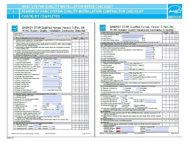 ENERGY STAR® QUALIFIED HOMES HVAC SYSTEM QUALITY INSTALLATION RATER CHECKLIST SECTION 1. REVIEW OF HVAC SYSTEM QUALITY INSTALLATION CONTRACTOR CHECKLIST 2 1. 1. HVAC System Quality Installation Contractor checklist completed in its entirety and collected for records, along with documentation on ventilation system (1. 3), full load calculations (2. 18), AHRI certificate (3. 15), and balancing report (10. 2). HVAC System Quality Installation Rater Checklist