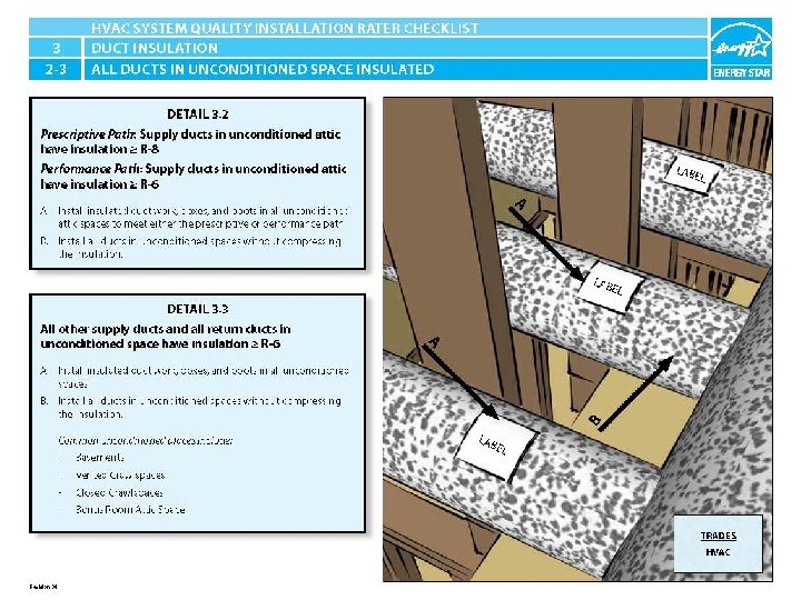 ENERGY STAR® QUALIFIED HOMES HVAC SYSTEM QUALITY INSTALLATION RATER CHECKLIST SECTION 3. DUCT INSULATION : Applies to All Heating, Cooling, Supply Ventilation, and Pressure Balancing Ducts 14 3. 1 All connections to trunk ducts in unconditioned space are insulated. 3. 2 Prescriptive Path: Supply ducts in unconditioned attic have insulation > R-8. Performance Path: Supply ducts in unconditioned attic have insulation > R-6. 3. 3 All other supply ducts and all return ducts in unconditioned space have insulation > R-6.