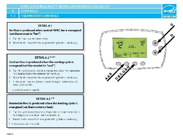 ENERGY STAR® QUALIFIED HOMES HVAC SYSTEM QUALITY INSTALLATION RATER CHECKLIST SECTION 6. CONTROLS 6. 1 Air flow is produced when central HVAC fan is energized (set thermostat to “fan”). 6. 2 Cool air flow is produced when the cooling cycle is energized (set thermostat to “cool”). 19, 20 6. 3 Heated air flow is produced when the heating cycle is energized (set thermostat to “heat”). 19 6. 4 Continuously-operating ventilation & exhaust fans include readily accessible override controls.