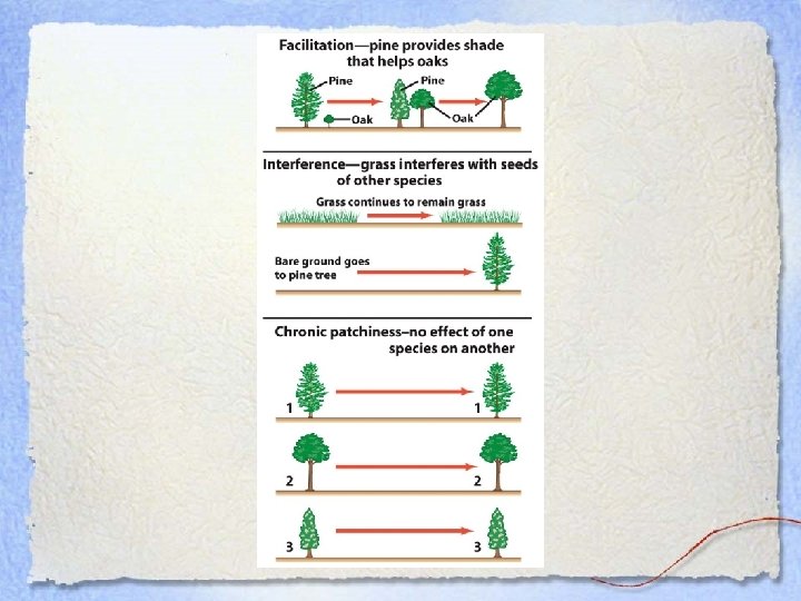 1. Facilitation • During succession, one species prepares the way for the next (and may even be necessary for the occurrence of the next) • Example: The pine tree provides the shade to allow the oak to grow.