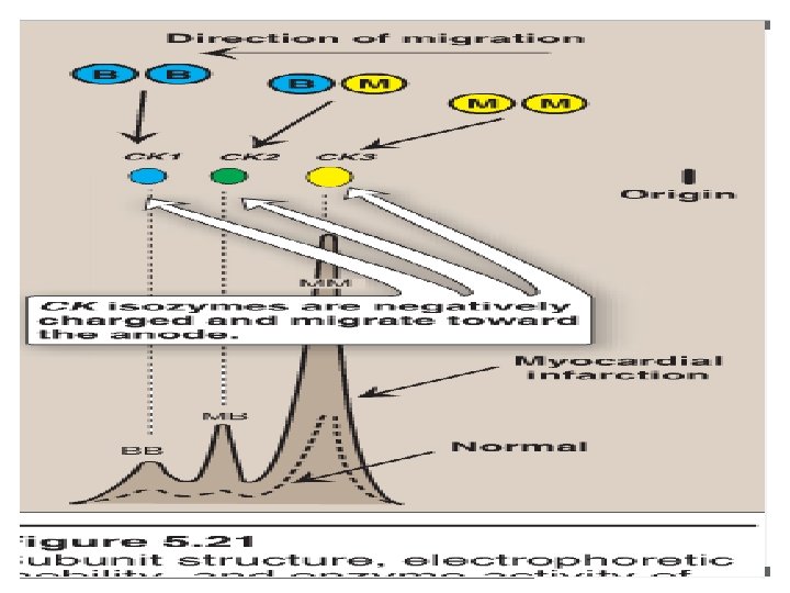 Plasma Creatine Kinase (CK) 1. CK is required for conversion of creatine into creatine phosphate 2. It is formed of two subunits (B & M) 3. CK has 3 isoenzymes: Skeletal muscle: > 98% CK-MM & 2 % CK-MB Heart muscle: 70% CK- MM& 20 & 30%CK-MB Brain : CK-BB These isoenzymes can be separated according to their physical properties using electrophoresis