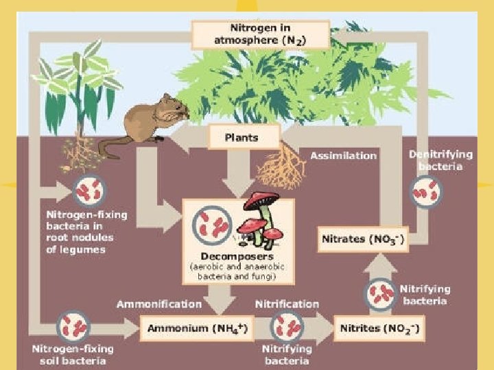 Nitrogen Cycle Questions l l l What are the main nitrogen containing nutrients in the biosphere? – ammonia, nitrate, nitrite – the amount of available nutrients What controls the primary productivity of an ecosystem? What is a limiting nutrient? – a single nutrient that is scarce or cycles very slowly l Why do algal blooms occur? – when more nutrients are available and producers can produce more than consumers can eat l What does “equilibrium” of an ecosystem mean? – equilibrium = balance