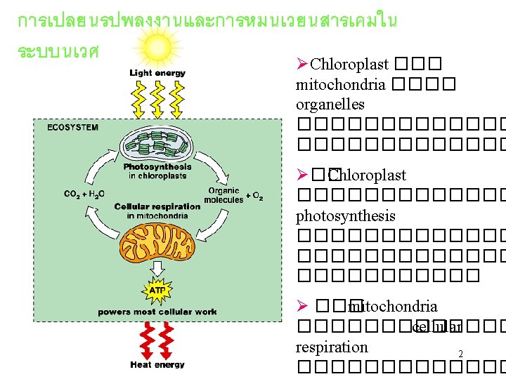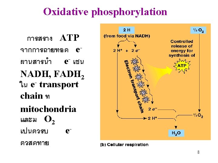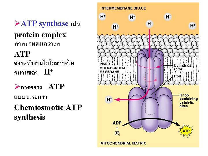 The pathway of electron transport ØETC ประกอบดวย electron carrier molecules (ตวรบ e)ทอยใน inner mitochondrial membrane Øตวรบ e- จะรบเฉพาะ e- ØH + จะถกปลอยออกมาและถกส งออกไปท intermembrane space 31