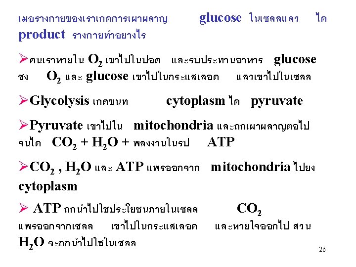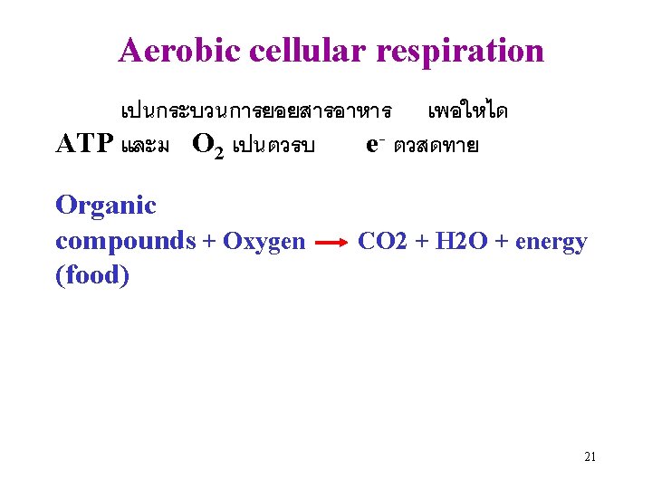 แตโดยทวไป cellular respiration จะอธบายถง Oxidation ของ glucose 6 C 6 H 12 O 6 + 6 O 2 6 CO 2 + 6 H 2 O + energy 22