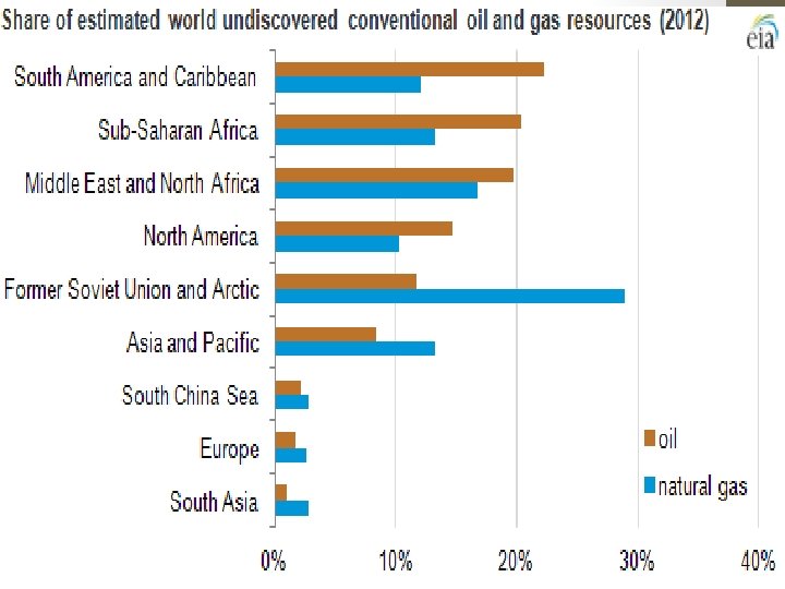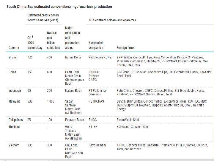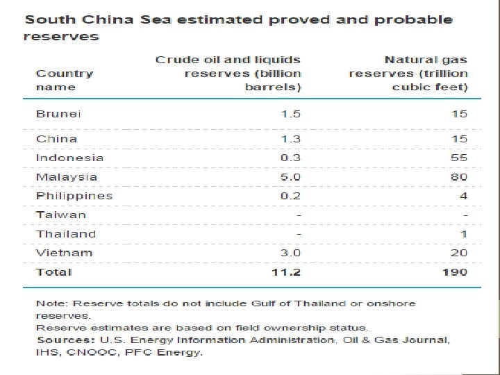 SCS as a source of hydrocarbons • • USGS (2012) estimated that about 12 bbl of oil and 160 tcf of natural gas might exist as undiscovered resources in SCS, excluding Gulf of Thailand other adjacent areas. About 1/5 of these may be found in such areas as Reed Bank CNOOC (Nov 2012) estimated SCS holds around 125 bbl of oil and 500 tcf of natural gas in undiscovered resources