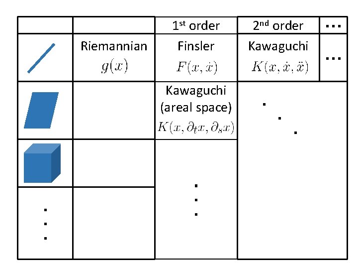 Riemannian 1 st order Finsler 2 nd order Kawaguchi Kawaguchi (areal space) ・ ・ ・ ・・・ ・ ・ ・ ・ ・ Reparametrization ・ invariant