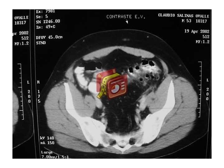 Diverticulitis • Inflamación divertículo y tejido pericolónico • 10 a 20% de los pacientes que conocen su enfermedad la desarrollan • Clínica: A veces pobre en el anciano – Dolor intenso abdominal (FII), irritación peritoneal, fiebre, abdomen quirúrgico. Leucocitosis – Perforación: absceso, neumaturia, fístulas • En diagnóstico útil Ecotomografía y TAC • Colonoscopía en frío confirmar patología y descartar neoplasia • 22– 30% de los individuos que presentan un primer episodio de diverticulitis presentarán un segundo episodio
