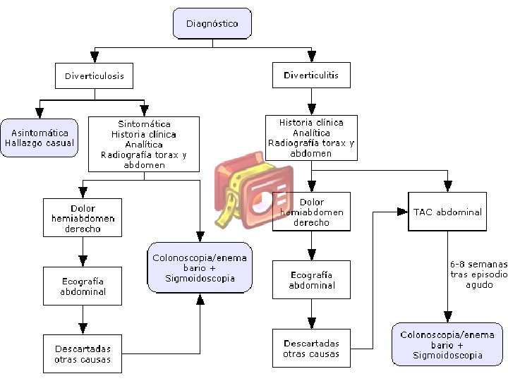 Diverticulitis • Diagnóstico diferencial – Carcinoma de intestino – pielonefritis – EII – appendicitis – Colitis isquémica – Síndrome de colon irritable – Enfermedad inflamatoria pélvica