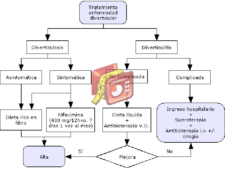 Tratamiento Médico • Dieta baja en residuos aguda • Antibióticos durante 7– 14 días (Amoxicilina/Acido clavulánico, Trimetroprim- sulfametoxazol, o Quinolona+Metronidazol durante 7– 10 días) – Luego de iniciar el tratamiento, se espera mejoría en 48– 72 horas – Es importante cubrir contra E. coli y Bacteroides fragilis – Si no se observan mejorías en 48– 72 horas, buscar una colección intra-abdominal. • Tratamiento hospitalizado: Pacientes con signos y síntomas severos (1– 2% de los casos)
