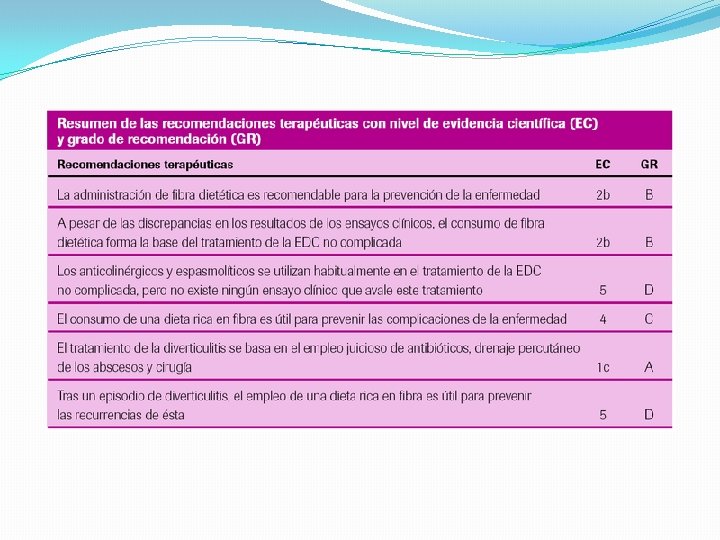 TRATAMIENTO MEDICO: Durante el fibras ? ? Durante elepisodioagudo: agudo. Restringir : restringir fibras? ? ? Mesalaxina Acorta el curso de la enfermedad. Prolonga su efecto con el uso concomitante con ATB. Probioticos Previene las recurrencias. Probioticos lactobacilii spp.