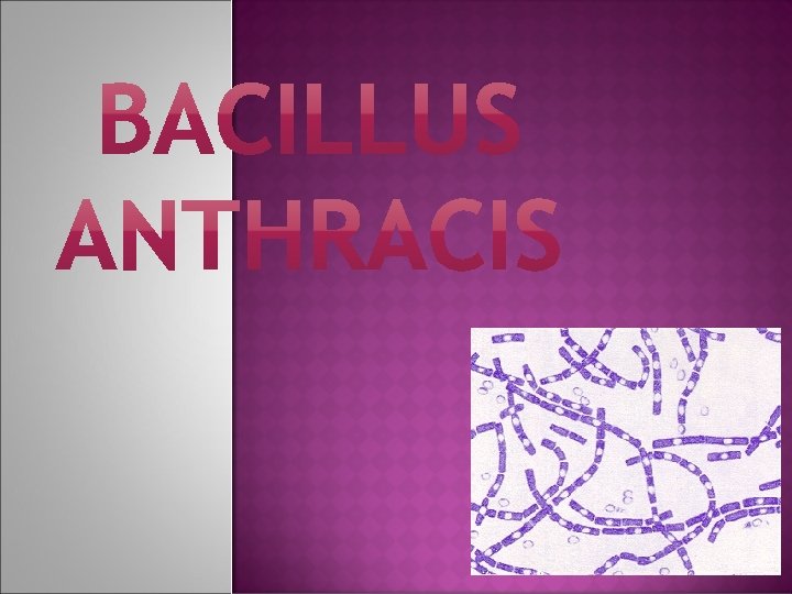 �Bacillus anthracis es inmóvil y capsulada. La endospora característica de Bacillus es de forma redondeada y de situación central, sin deformar la célula. Cada célula mide entre 1 y 6 cm. Las esporas son muy resistentes a la temperatura y a los desinfectantes químicos, aunque se muestran muy sensibles a la penicilina.