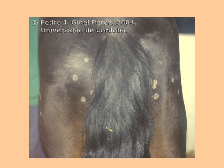 DERMATOMICOSIS Etiología Período de incubación Tasa de letalidad Vía de transmisión Trichophyton sp. - Microsporum sp. 1 - 4 semanas 0% Contacto directo / indirecto Areas depiladas Sintomatología Formación de costras Pelos quebradizos Al laboratorio Diagnóstico diferencial Terapéutica Pronóstico Zoonosis Escaras y pelos cercanos a la lesión Dermatitis de diversa etiología Pomadas antibióticas - Iodopovidona Favorable Sí Nachon Cicciarella, H. - Bosisio, C. Enfermedades Infecciosas de los Equinos 2ª. Edición - 2003