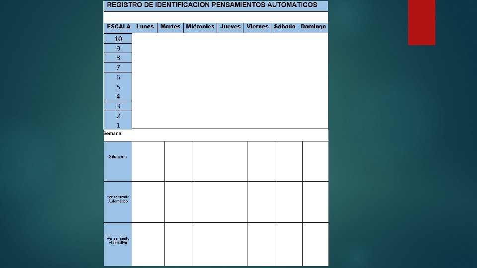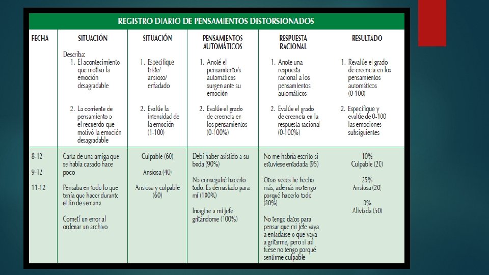 Registro, control y monitoreo de las emociones Inventarios Escala de Ansiedad (Beck) Escala de Depresión (Beck) Inventario de Distorsiones Cognitivas (Beck)