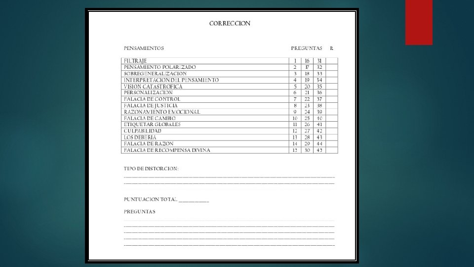 Inventario de Distorsiones Cognitivas A 1 -16 -31 Filtraje B 2 -17 -32 Pensamiento polarizado C 3 -18 -33 Generalización D 4 -19 -34 Lectura de pensamiento E 5 -20 -35 Catastrofización F 6 -21 -36 Personalización G 7 -22 -37 Falacia de control H 8 -23 -38 Falacia de justicia I 9 -24 -39 Razonamiento emocional J 10 -25 -40 Falacia de cambio K 11 -26 -41 Etiquetas L 12 -27 -42 Culpabilidad M 13 -28 -43 Los debería N 14 -29 -44 Falacia de razón Ñ 15 -30 -45 Falacia de recompensa divina Puntajes Altos 1. 2. 3. -