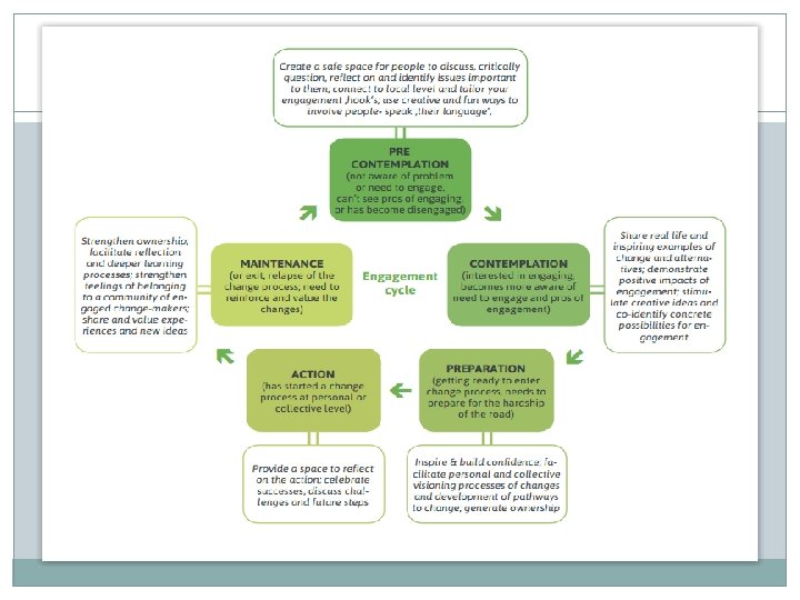 Boîte à outils �Méthodologie ABCD centrée sur les richesses �Visualiser les processus de changement (voir Transition) �Théorie de changement �Jeu du bocal à poissons �Modèle du cheminement de l’engagement
