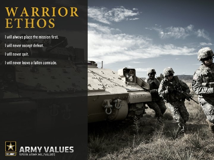 “Many people know what the words Loyalty, Duty, Respect, Selfless Service, Honor, Integrity, and Personal Courage mean. But how often do you see someone actually live up to them? Soldiers learn these values in detail during Basic Combat Training (BCT), from then on they live them every day in everything they do — whether they’re on the job or off. In short, the Seven Core Army Values listed below are what being a Soldier is all about. ” http: //www. army. mil/values