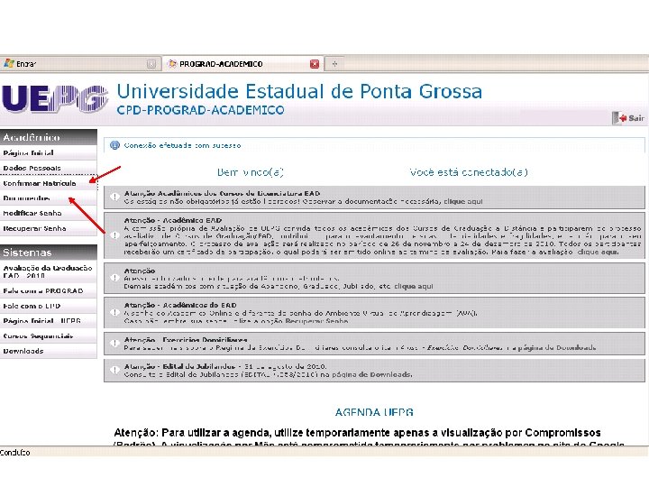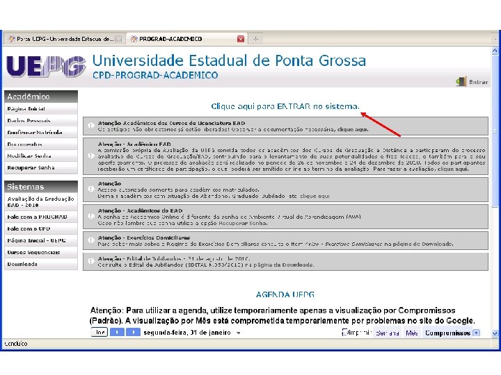 Acadêmico on-line • Como entrar no sistema: • Encaminhar-se a prograd, localizada no prédio da reitoria, tendo em mãos o extrato de matricula, que é fornecido no dia da matrícula, para conseguir a senha; • Acessar site da uepg (http: //portal. uepg. br/); • Clicar no link: acadêmico on-line; • Digitar RA e senha.