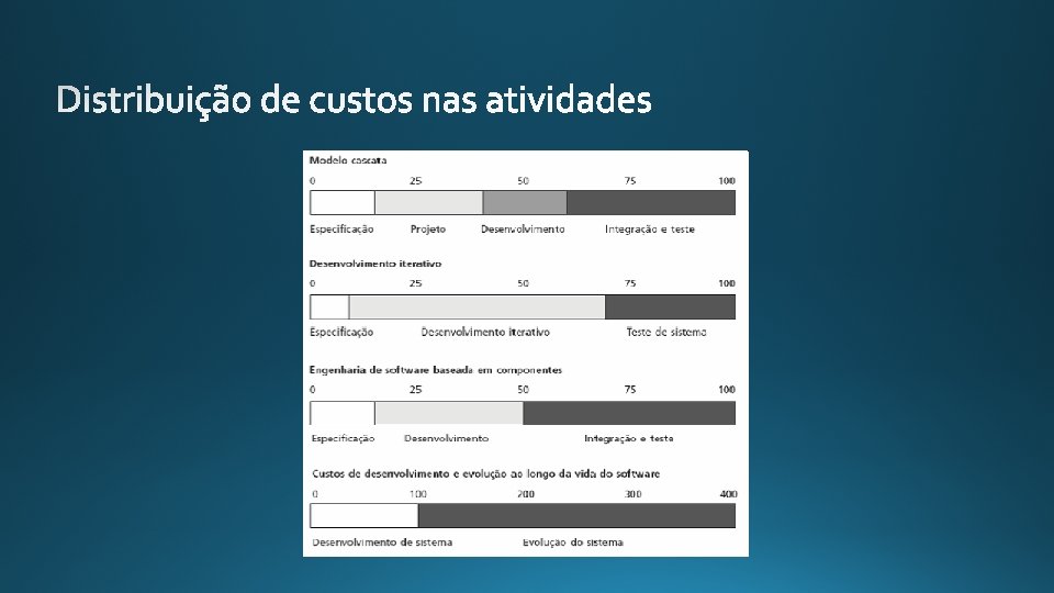 • Aproximadamente 60% dos custos são custos de desenvolvimento e 40% são custos de testes. Para software sob encomenda, os custos de evolução normalmente excedem de desenvolvimento. • Os custos variam dependendo do tipo de sistema que está sendo desenvolvido e dos requisitos de atributos de sistema, tais como desempenho e confiabilidade. • A distribuição de custos depende do modelo de desenvolvimento que é usado.