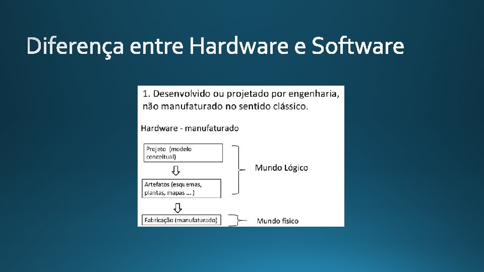 • Software é um produto desenvolvido pelo Eng. De Software e Hardware é um produto desenvolvido pelo Engenheiro Eletrônico ? • Software é lógico • Hardware é físico