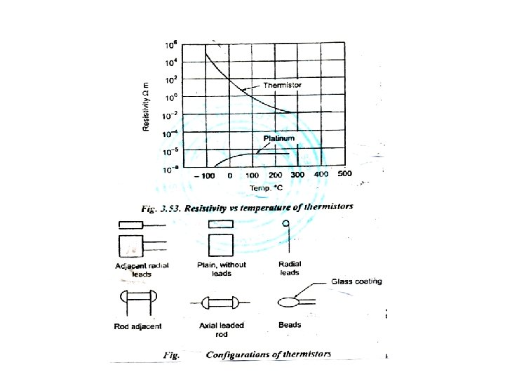 Thermistors: • Thermistor is a temperature sensitive variable resistor made of a ceramic like semiconducting material. They are made of metal oxides and their mixtures like oxides of cobalt, copper, nickel, etc. Unlike metals, thermistors respond negatively to temperature. They behave as resistors with a high negative temperature coefficient of resistance. Typically, for each 1 C rise in temperature, the resistance of a thermistor decreases by about 5%. This high sensitivity to temperature changes makes thermistor useful in precision temperature measurements. The resistance of thermistors vary from 0. 5 to 0. 75 M . Variation of resistivity with temperature is shown in figure.