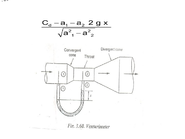 VENTURI PRINCIPLE • This is just like an orifice meter. It has three distinct parts, namely convergent cone, throat and divergent cone. A manometer measures the pressure difference between two sections as shown in figure. • • Let a 1 Area at the inlet (1 -1) • A 2 Area at the section (2 -2) • x Pressure head difference • Cd Discharge coefficient • •