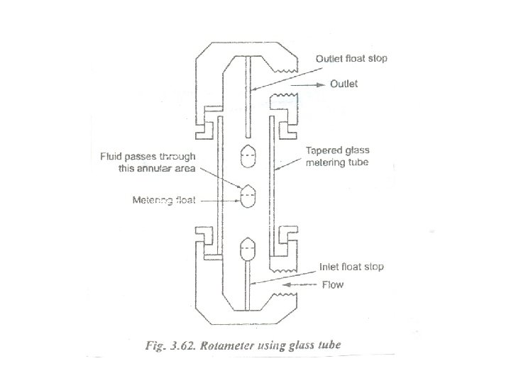 ROTO METERS • Rotameter: • A rotameter is a variable area type flow meter. It consists of a vertical tapered tube with a float which is free to move within the tube. The fluid goes from the bottom to the top. When no fluid flows, the float rests at the bottom of the tube. The float is made of such a diameter that it completely blocks the inlet. When flow starts in the pipeline and fluid reaches the float, the buoyant effect of fluid makes the float lighter. The float passage remains closed until the pressure of the flowing material plus the buoyance effect exceeds the downward pressure due to the float weight. Thus, depending on flow, the float assumes a position. Thus the float gives the reading of flow rate.