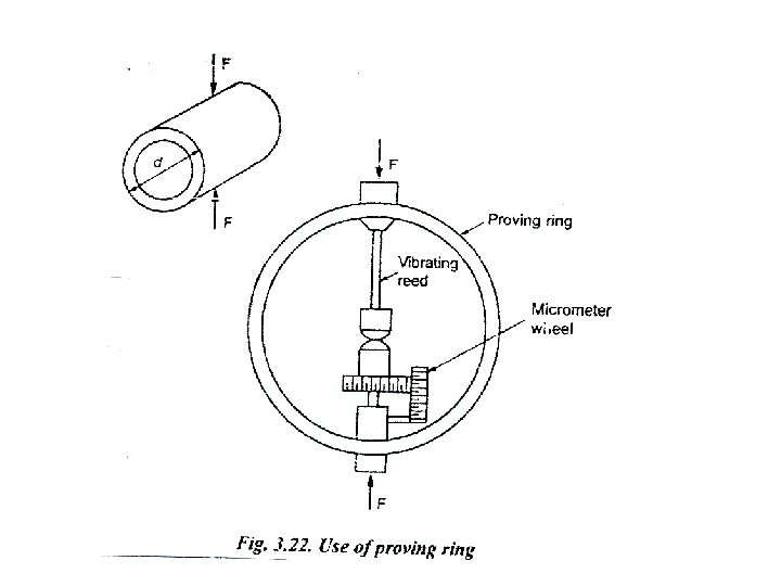 PROVING RING • • Use of proving Rings Proving rings are steel rings used for calibration of material testing machines in situations where, due to their bulkness, dead weight standards cannot be used. P ring is a circular ring of rectangular section and may support tensile or comprehensive force across its diameter. the change in radius in the direction of force, is given by where d is the outer diameter of the ring and K is stiffness. Deflection of the ring is measured using a precision micrometer. To get precise measurements, one edge of the micrometer is mounted on a vibrating reed which is plucked to obtain a vibratory motion. The micrometer contact is then moved forward until a noticeable damping of the vibration is observed.