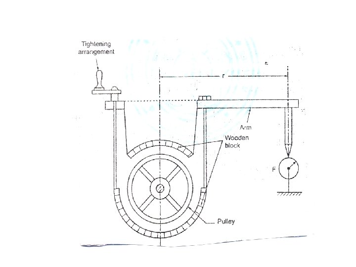 DYNAMO METERS • • • Mechanical Dynamometer: These come under the absorption type. An example for this kind is prony brake. In Prony brake, mechanical energy is converted into heat through dry friction between the wooden brake blocks and the flywheel (pulley) of the machine. One block carries a lever arm. An arrangement is provided to tighten the rope which is connected to the arm. Rope is tightened so as to increase ht frictional resistance between the blocks and the pulley. If F – Load applied and Power dissipated r - Lever arm N – Speed of flywheel (rpm) Torque T = F. r The capacity of Prony brake is limited because: Due to wear of wooden blocks, friction coefficient varies. So, unsuitable for large powers when used for long periods. To limit temperature rise, cooling is to be ensured.