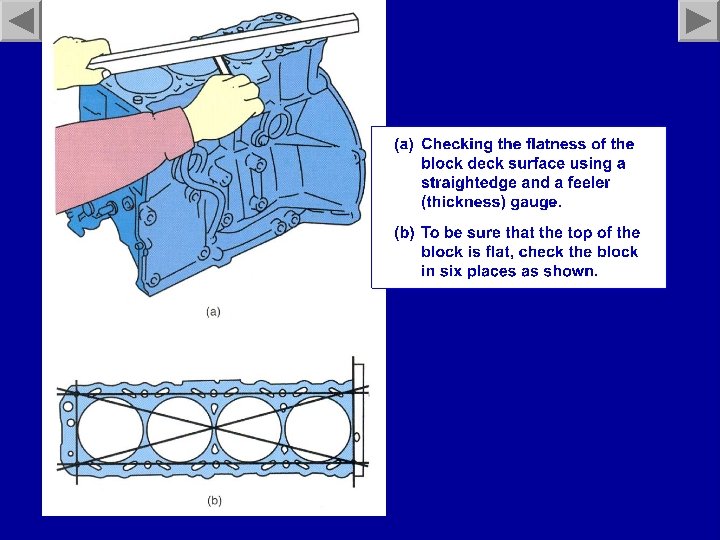Decking the Block • The deck of the block should not be warped to insure a sufficient head gasket seal. • Concurrently, block deck should be parallel to the main bearing bores. • Block deck is checked with a straightedge and a feeler gauge at six different positions, check manufacturers specifications.